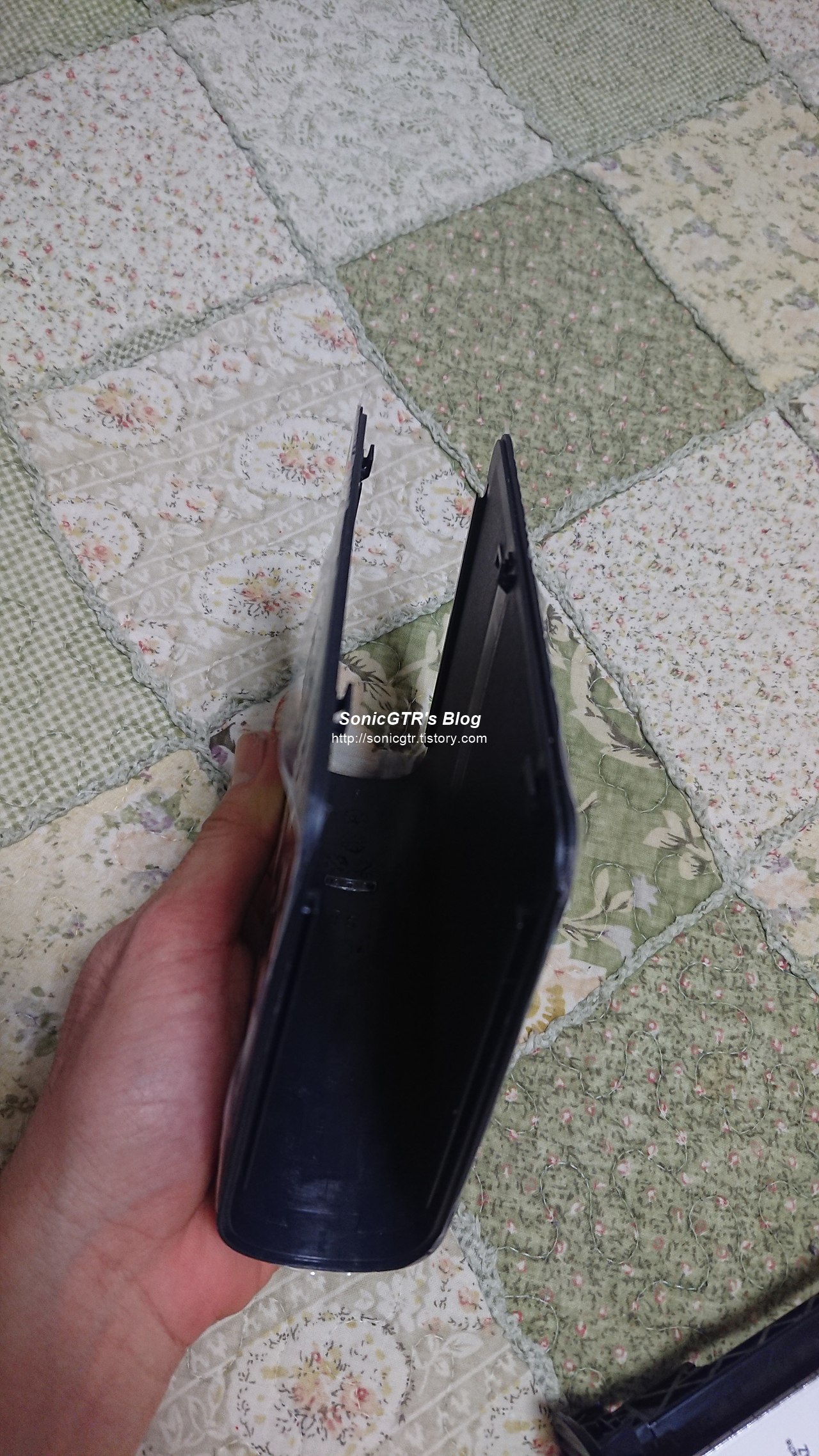 그리 어려운 일도 아니고, USB/전원 단자가 있는쪽의 케이스 틈새에 신용카드 같은걸로 조심스럽게 벌리면 플라스틱 끼리 물려있는 걸쇠가 풀리게 됩니다.