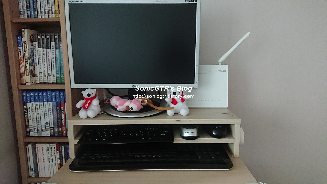 조립하고 LG L194WT 19인치 와이드 모니터와 공유기를 올려놓고, 키보드 숨김 자리에는 풀사이즈 키보드 1개와 휴대용 미니키보드, 마우스 2개를 넣어둔 모습입니다.