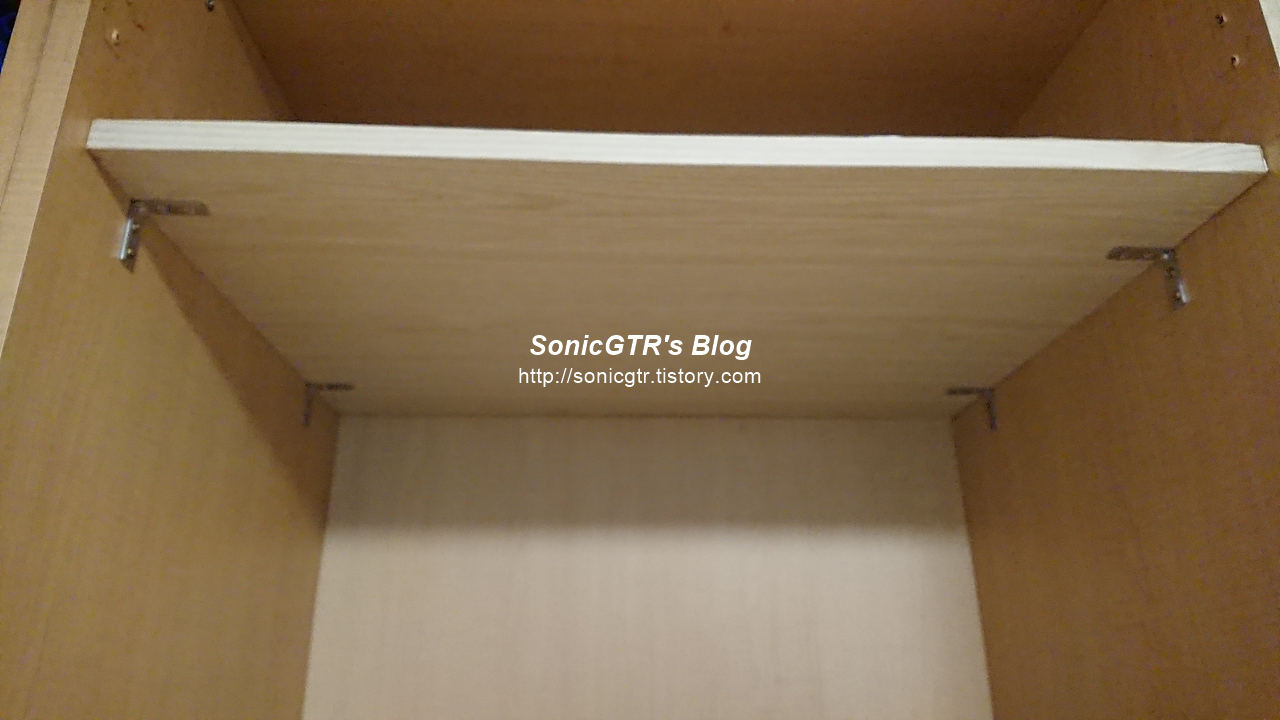 원칙대로라면 붙박이장을 철거한다음 붙박이장의 뼈대가 되는 합판 부분에서 직결 나사를 이용해 선반을 고정하는것이지만, 붙박이장을 철거 하기에는 제 체력도 부족하고 붙박이장 자체도 타카 핀 같이 비 파괴적인 방법으로 철거가 안되게끔 해놓은게 보여서 꺽쇠를 이용해 선반을 고정하기로 했습니다.