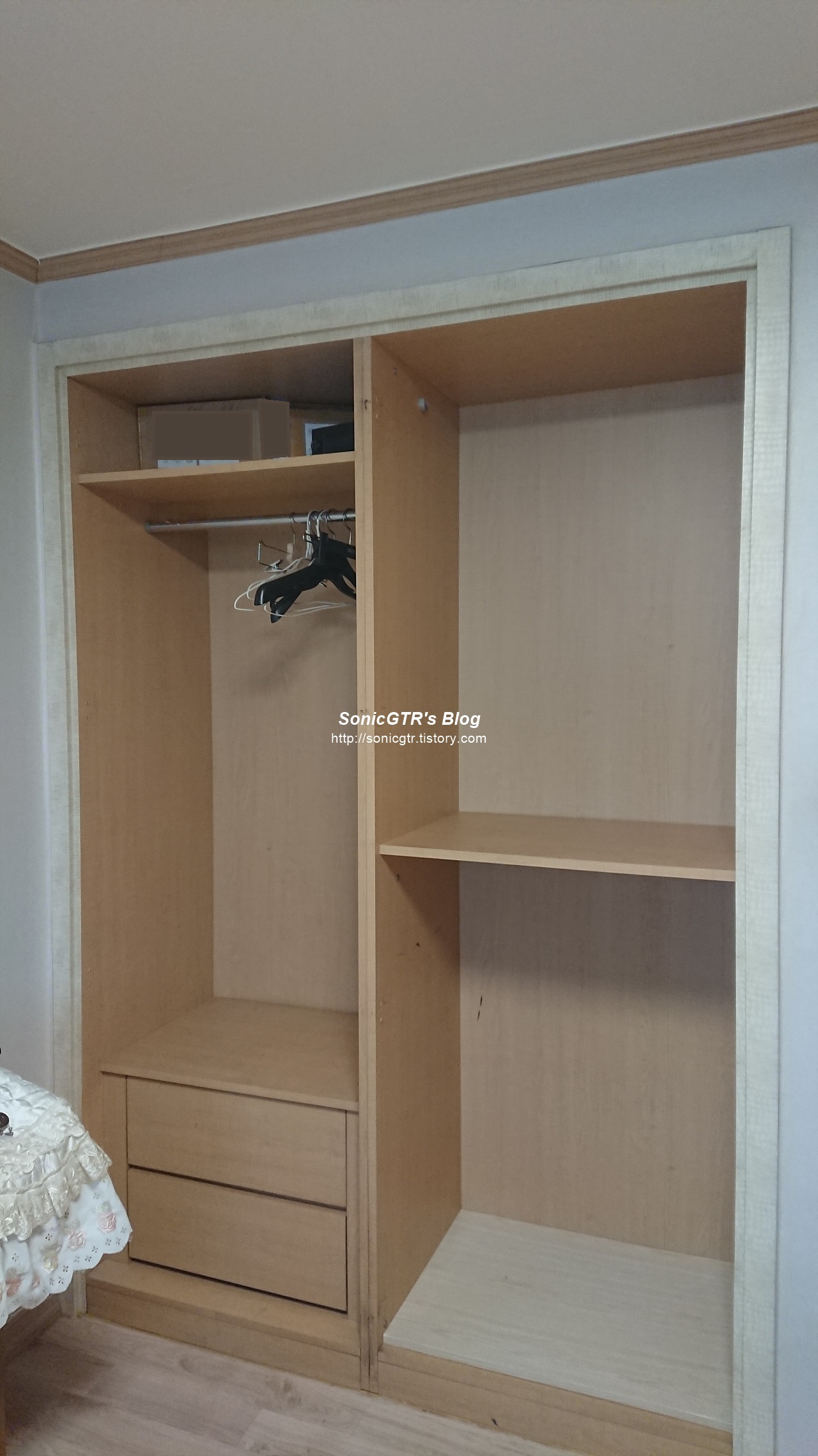 가로 폭을 조금 넉넉하게 잡은 탓에 붙박이장에 한번에 들어가진 않더군요.