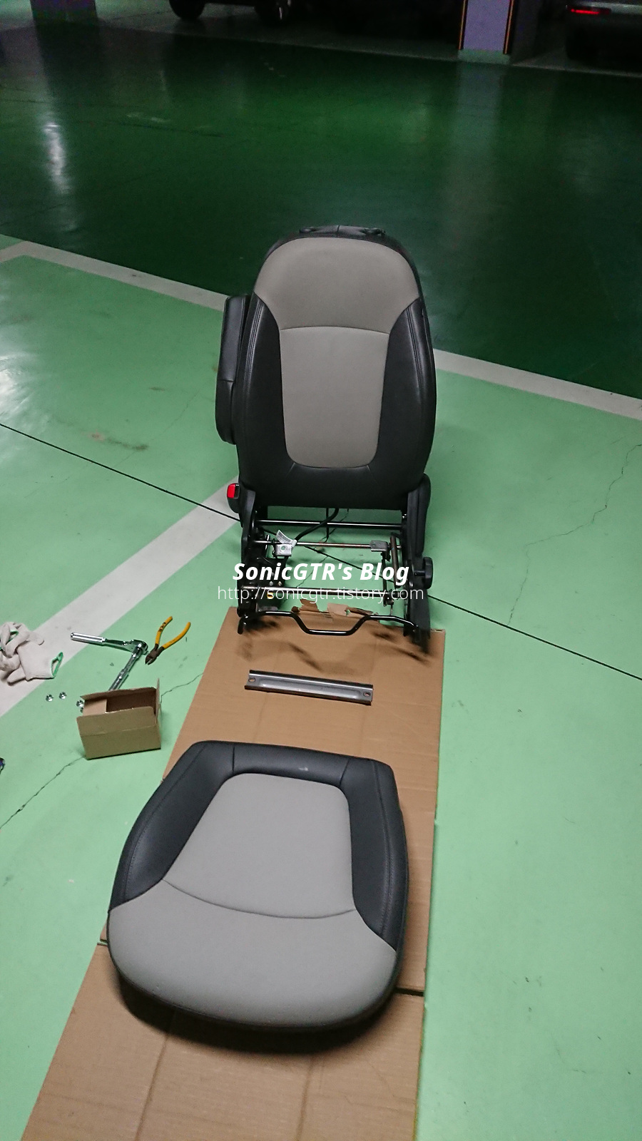 방석 쪽은 교환이 어렵지 않습니다. 시트를 차 밖으로 빼낸다음 시트 하부에서 방석 프레임 고정너트 4개 풀면 끝.