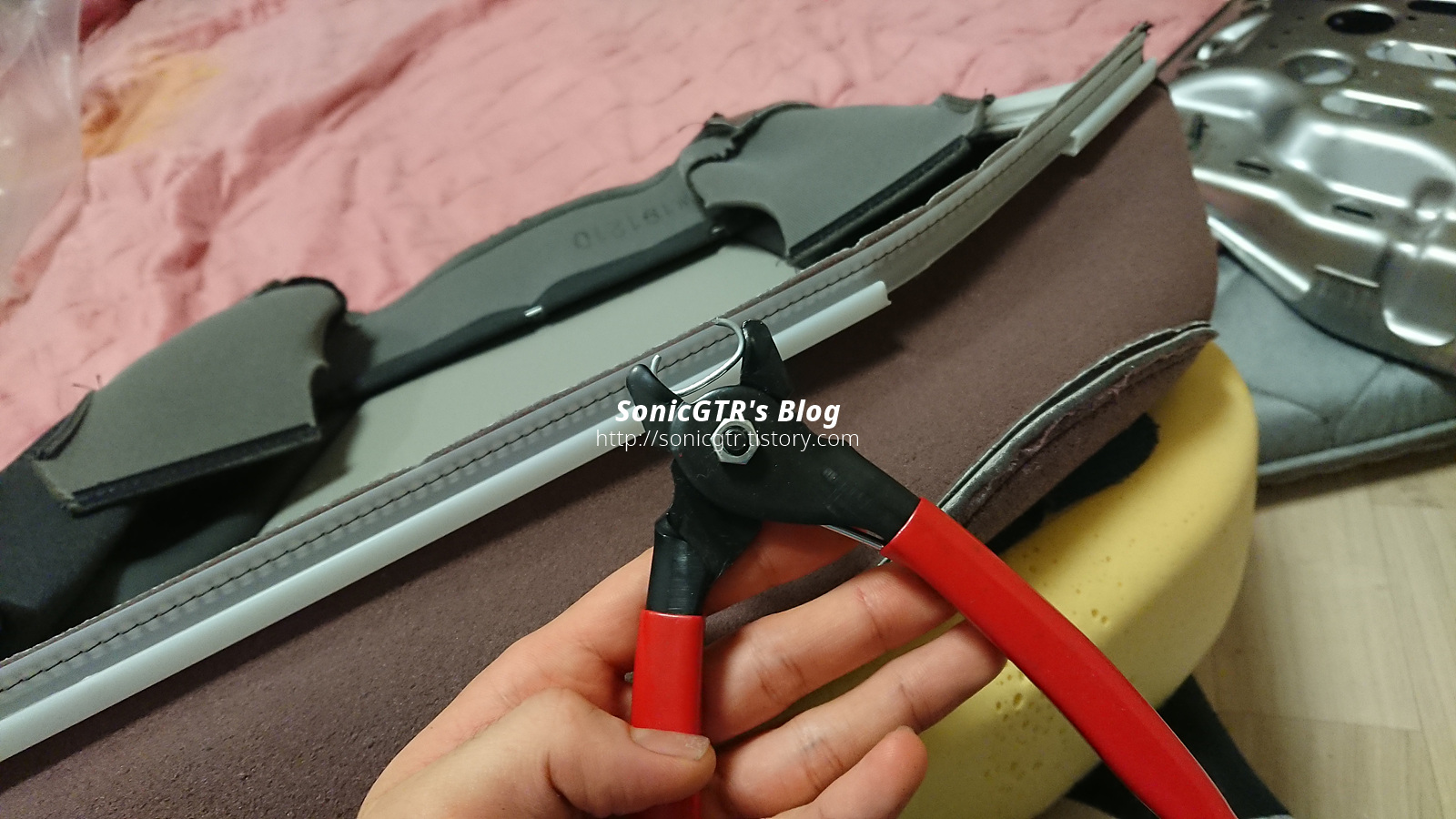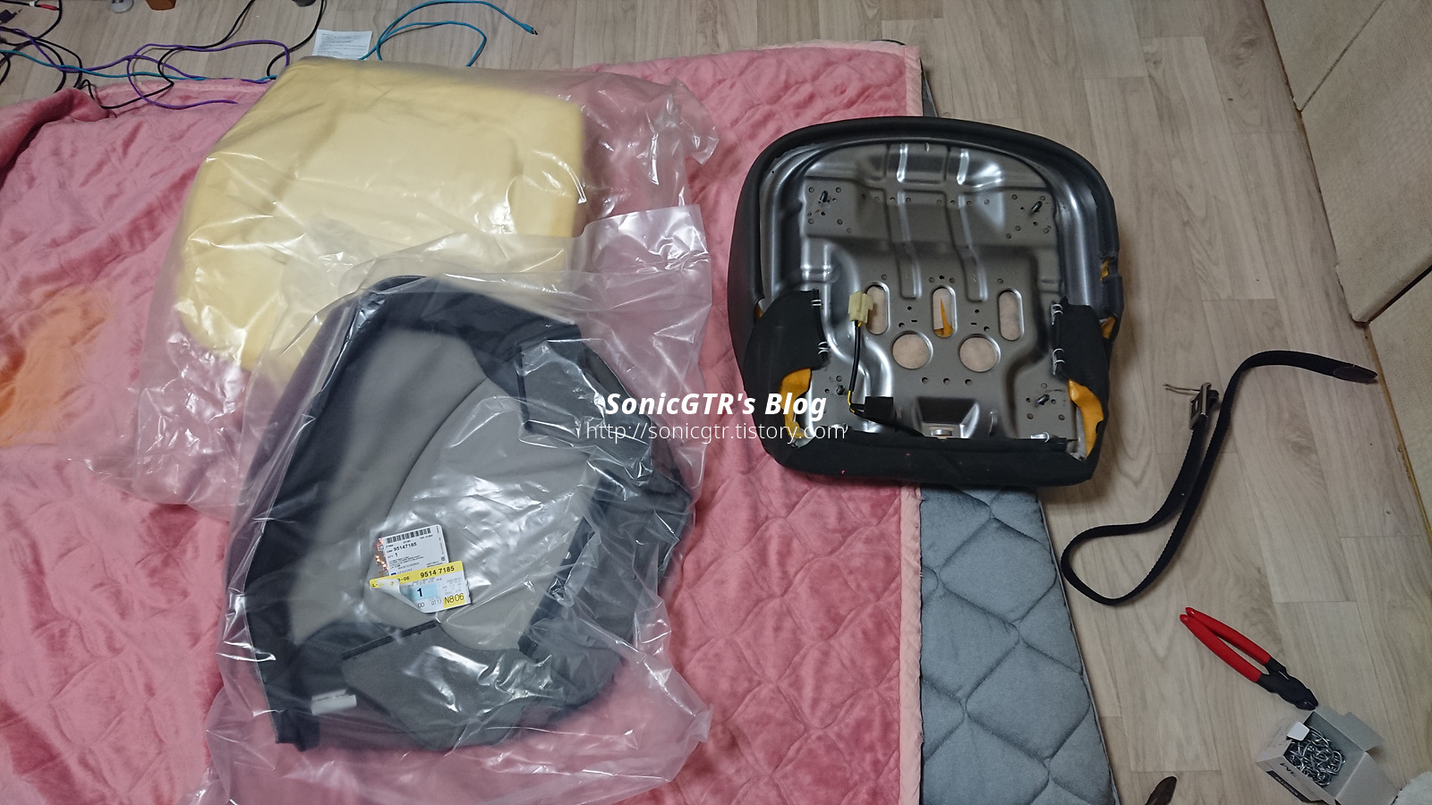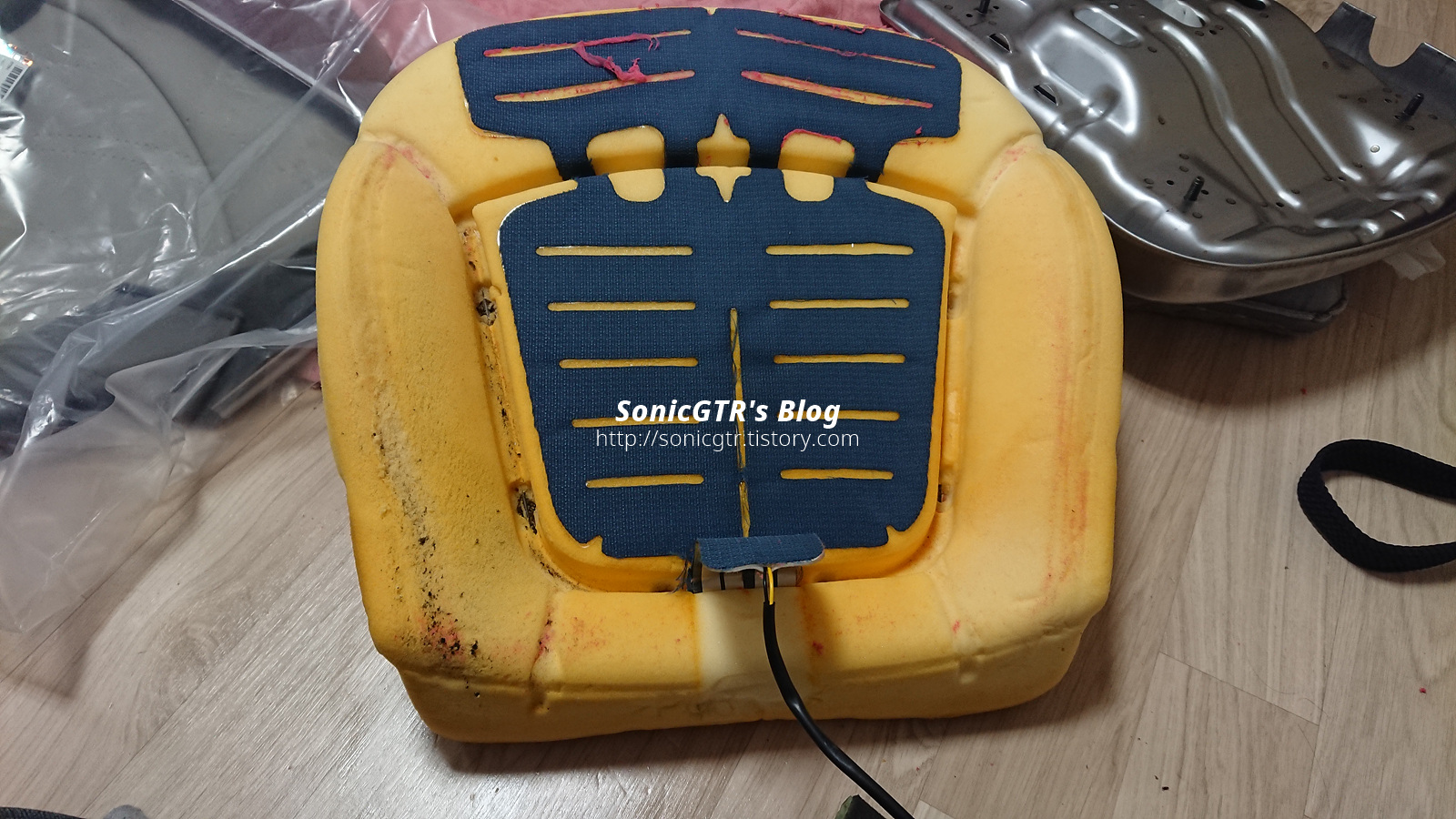 갈 녀석과 새로 붙일 메모리폼. 열선 미리 메모리폼에 붙여두고 시트 프레임에 장착합니다.
