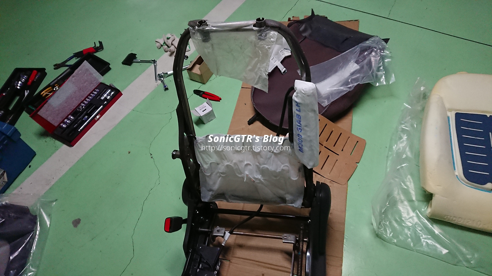 메모리폼을 뺀 시트 프레임의 모습. 경차 시트라서 그런지 아주 단순한 형상이네요. 프레임 자체도 꽤 가볍습니다.