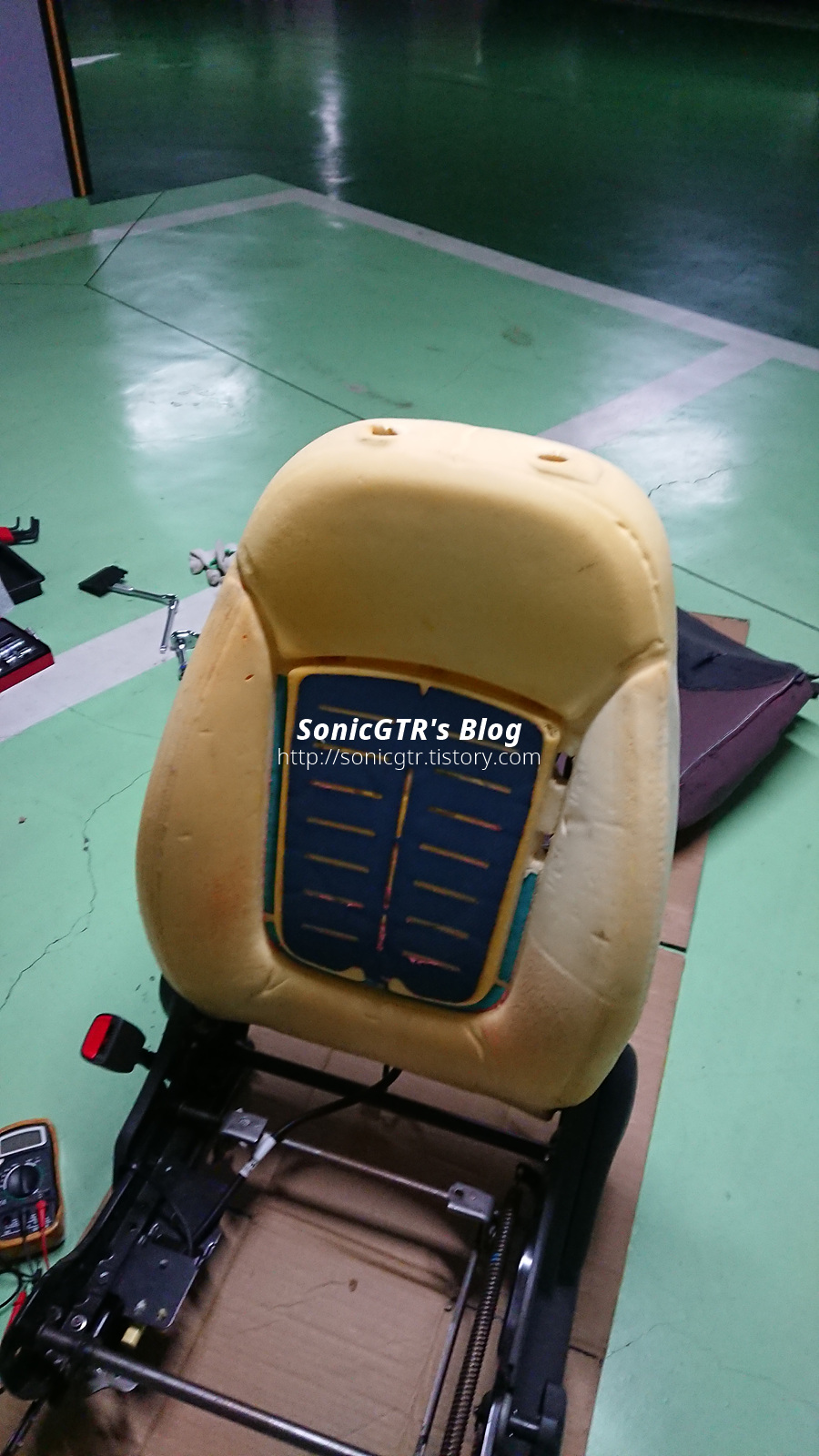 인조가죽을 벗기기 바로 전에 헤드레스트 가이드 양측을 시트 프레임 안쪽에서 손으로 고정 래치를 오므려줘서 빼버리고, 인조가죽을 훌렁 벗겨낸 모습입니다.