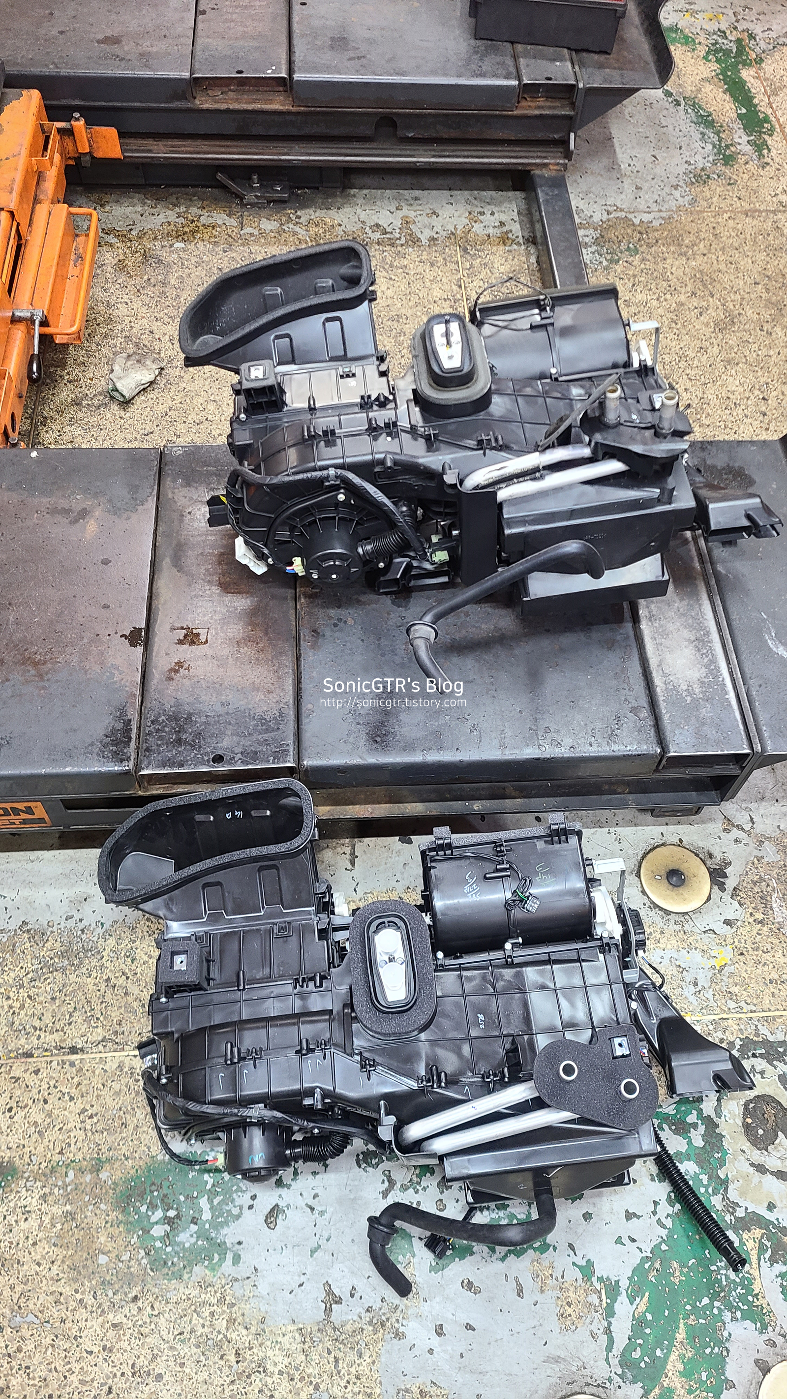 제 차의 실내기가 저렇게 파손된 원인은, 히터코어 교환 작업시 무리한 작업과정 (에어컨 실내기를 탈거하지 않은 상태로 히터코어만 강제로 끄집어내는 방식으로 교환) 으로 인해 파손된 것입니다.