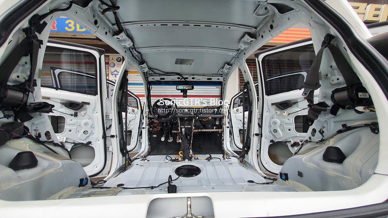 앞좌석 2개와 기어봉, 사이드 브레이크, 핸들과 계기판은 남겨둡니다. 어찌되었던 차를 정비소 안에 계속 남겨둘수는 없으니 차는 움직일수 있게 해야 했습니다.